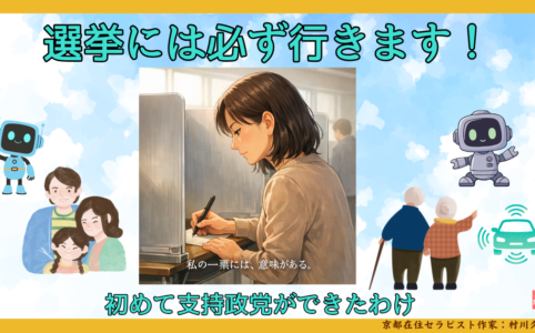 心の制限を外す/エッセイ 選挙には必ず行きます!~初めて支持政党ができたわけ~ Posted on 2026年2月6日 by murakawakumu0108 / 0件のコメント ▶ずっと政治に興味を持てなかった ずっと政治に興味なかったんです。お恥ずかしい話ですが、若い頃は選挙にも行っていませんでした。 「なんでやったんやろう?」って考えてみると、「どうせ誰がなってもおんなじやし……」...