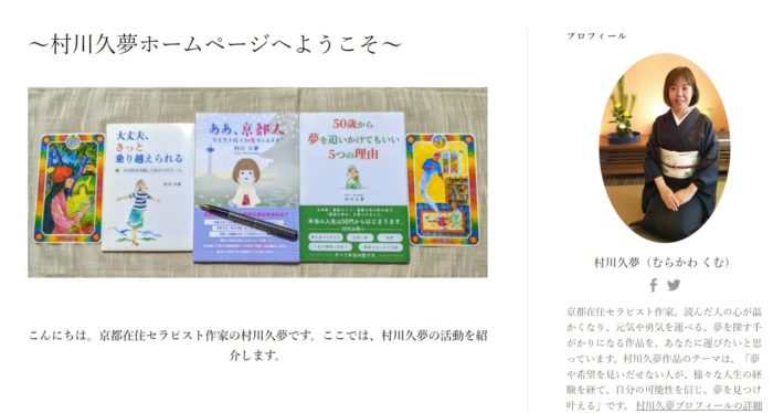 *村川久夢ホームページトップには、新著『ああ、京都人~今を生き抜く知恵おしえます~』や前著『50歳から夢を追いかけてもいい5つの理由』に頂いた感想を多数掲載しています。