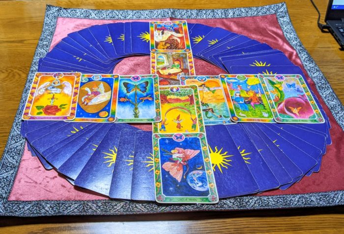 私が引いたカードは、「⑦魔法使い、⑧ワンドの7、⑨ソードのガーディアン、⑩ワンドのChild」でした。