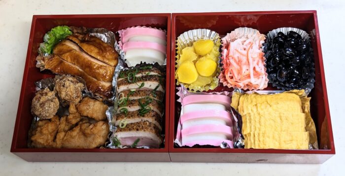 おせちは、どうしようか迷いましたが、お正月からコンビニのお弁当はわびしいので、買ってきた具材を重箱につめて、なんとかお正月のお重らしくしました。