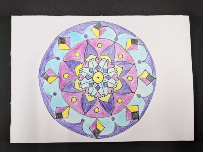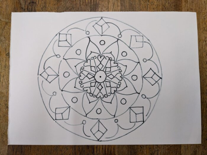 コンパス、定規、黒マジック、水彩色鉛筆を使って、下絵からマンダラを描きました。すごく集中できて、雑念が吹っ飛んだ感じでした。