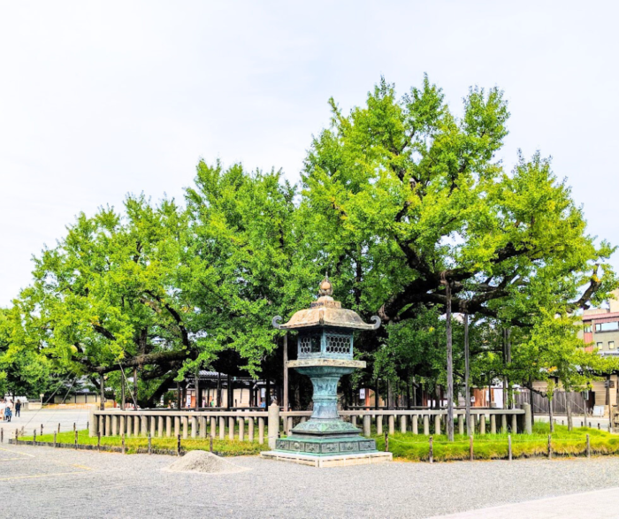 世界遺産に指定されている西本願寺の御影堂門をくぐり、目隠塀を越えると、銀杏の巨木が目に入ります。これが樹齢約400年の「水吹き銀杏」です。