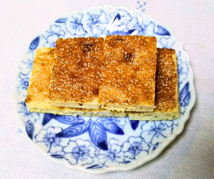松風は小麦粉、砂糖、白味噌などを混ぜて自然発酵させた生地を、表面にけしの実を振りかけて焼いた焼き菓子です。もっちりした独特の食感と白味噌の風味で美味しいです。