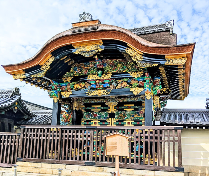 「唐門」(国宝)は、桃山時代の豪華な装飾彫刻を充満した檜皮葺き(ひわだぶき)・唐破風(からはふ)の四脚門(しきゃくもん)です。彫刻の見事さに日の暮れるのを忘れることから「日暮らし門」とも呼ばれています。(西本願寺ウェブサイトより)