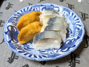 鯖寿司だけだとスーパーでもけっこうなお値段ですが、お稲荷さんが半分入ると、お手頃価格になるのもお気に入りの理由です。