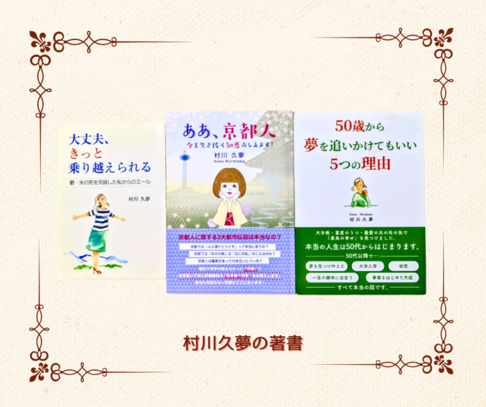 拙書『50歳から夢を追いかけてもいい5つの理由』は、村川久夢が「年だから」「今さら遅いから」など様々な心の制限を外し、他の誰かのためではなく、自分の心が望むことにしたがって生きるようになった経験を描いたノンフィクションです。