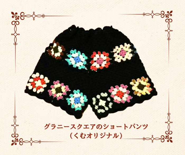 セラピスト作家になってからも、編物は好きでずっと編み続けていました。すると面白いものですね。「ひまわりのアクリルたわし」「グラニースクエアのショートパンツ」等のオリジナル作品を次々と編むことが出来たのでした。