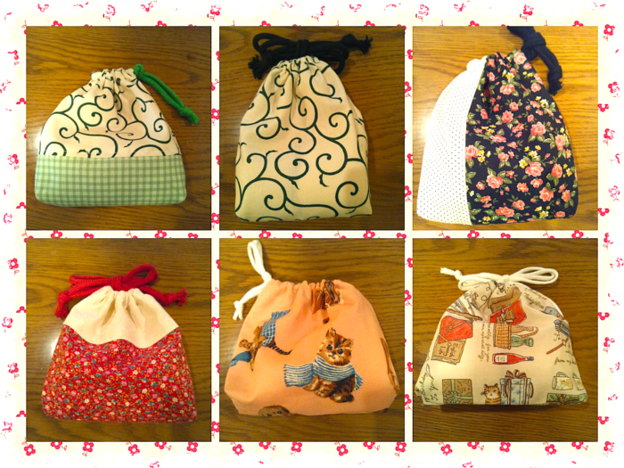 バレンタインデーにボルスターカバーの余り布を縫い合わせて巾着袋を縫いました。半端な余り布も縫い合わせると驚くほど可愛くなるのです。