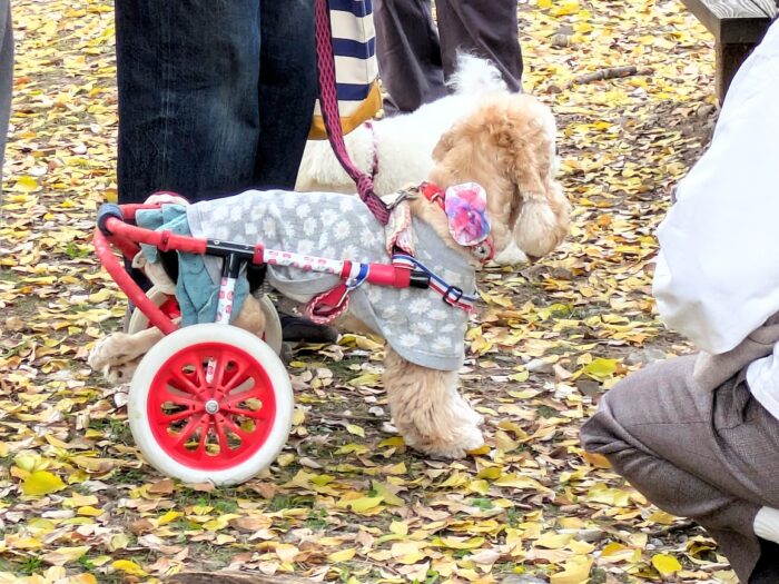 ワンちゃんの中には、車椅子の子もいました。足が不自由になっても、車椅子に乗せてもらって、お散歩につれてもらえるのですね。