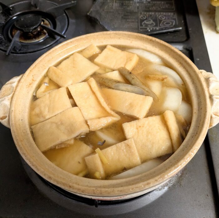 祝大根とごぼうとお揚げさんをさばの味噌煮缶で煮込んで、ちょっと怪しげな「ありあわせの炊いたん😅」を作りました。