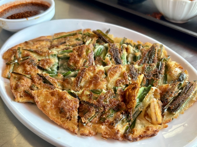 海鮮チヂミもタコ、ホルモン、エビとニラなどの野菜たっぷりで、一口食べた弟が「美味しい!」と思わず言うほどでした。