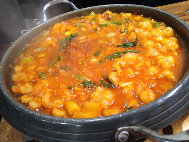 タコの歯ごたえのある食感、旨味たっぷりのホルモン、プリプリしたエビが、赤い汁とマッチして、辛いけれど、とっても美味しいです。