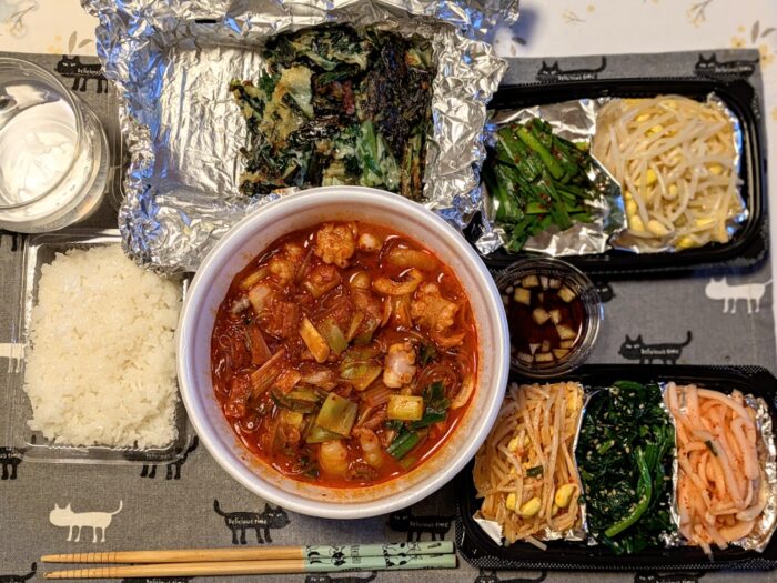 韓国料理店「ケミチプ」の「ナプコッセ(タコ、ホルモン、エビの辛い鍋)」、海鮮チヂミ、ナムル盛り合わせをテイクアウトしました。