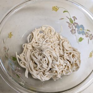 乾麺をボールにつけて、ボールごと冷蔵庫に入れました。当然、放置でOKなので、ブログの下書きを書いていたら、あっという間に1時間以上経ちました。