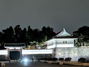 暗くなっていたので、皇居はほとんど何も見えませんでしたが、ライトアップされて美しく映える門がありました。運転手さんが「これが桜田門ですよ」と教えてくれたのです。