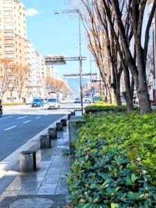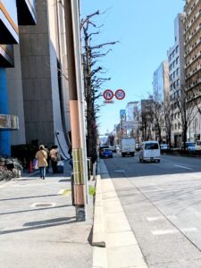 京都の道路、画像は「御池通」(東西の通)と「烏丸通」(南北の通)です。御池通は東山を見渡せるし、烏丸通は京都駅や京都タワーまで見通せます。