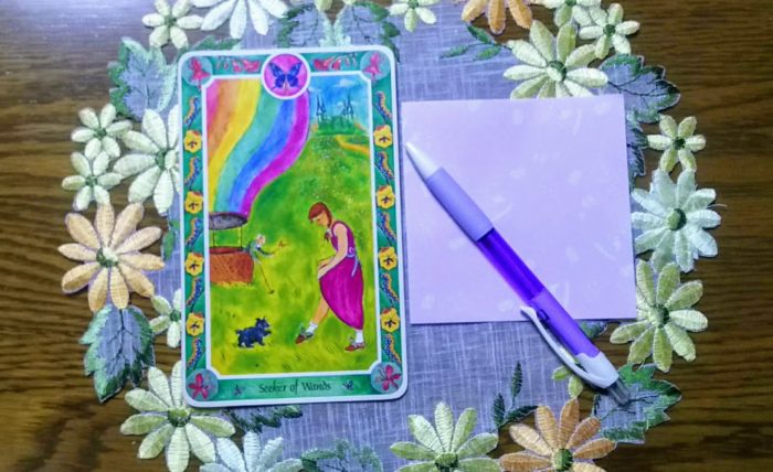 私はそこでAさんにインナーチャイルドカードを1枚引いてもらいました。「ワンドのSeeker:ドロシー」でした。そして、このカードから受けた印象や気持ちを書き出してもらいました。