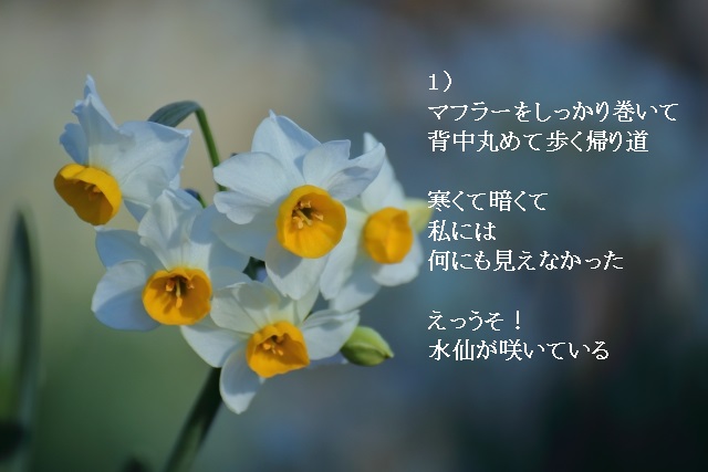 真っ暗な帰り道を、心も真っ暗で、凍えながら地面だけを見て歩いていると、水仙が咲いているのを見つけました。
