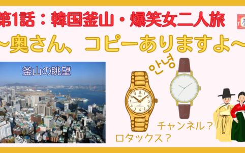 エッセイ/お出かけ 第1話:韓国釜山・爆笑女二人旅 ~奥さん、コピーありますよ~ Posted on 2025年6月21日 by murakawakumu0108 / 0件のコメント 「奥さん、コピーありますよ!」 と屋台のおにいさんに声をかけられたのは、韓国・釜山の国際市場。そこには驚くほどたくさんの露天が並んでいた。翌年の日韓ワールドカップ共催で日韓友好ムードがマックスの頃。 ブランド...